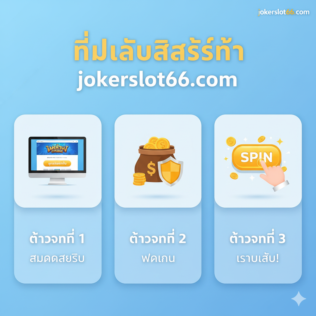ภาพสไตล์อินโฟกราฟิกที่เข้าใจง่าย แสดงขั้นตอนการ ‘ปั่นสล็อต’ ที่ jokerslot66.com แบ่งเป็น 3 ขั้นตอนง่ายๆ: (1) ไอคอนรูปคอมพิวเตอร์แสดงหน้าเว็บ jokerslot66 พร้อมปุ่ม ‘สมัครสมาชิก’ (2) ไอคอนการ ‘ฝากเงิน’ (Deposit) ที่ปลอดภัย (3) ไอคอนปุ่ม ‘SPIN’ ขนาดใหญ่กำลังถูกกด และมีเหรียญทองพุ่งออกมา สื่อถึงการเริ่มต้นความสนุกและลุ้นรางวัลใหญ่ได้ทันที ใช้พื้นหลังสีสะอาดตาและไอคอนที่ชัดเจนในโทนสีของเว็บไซต์